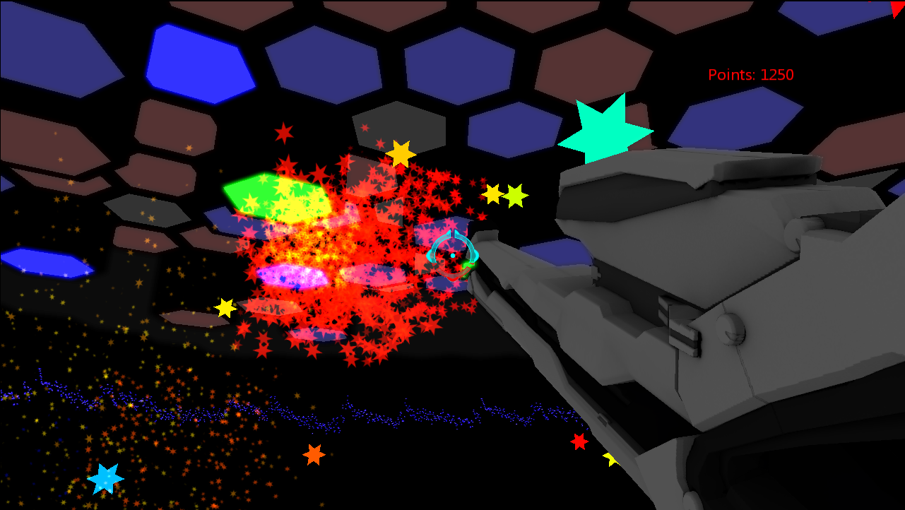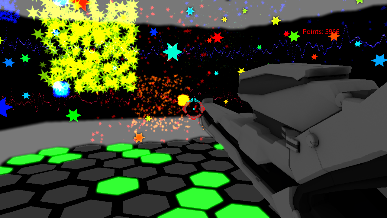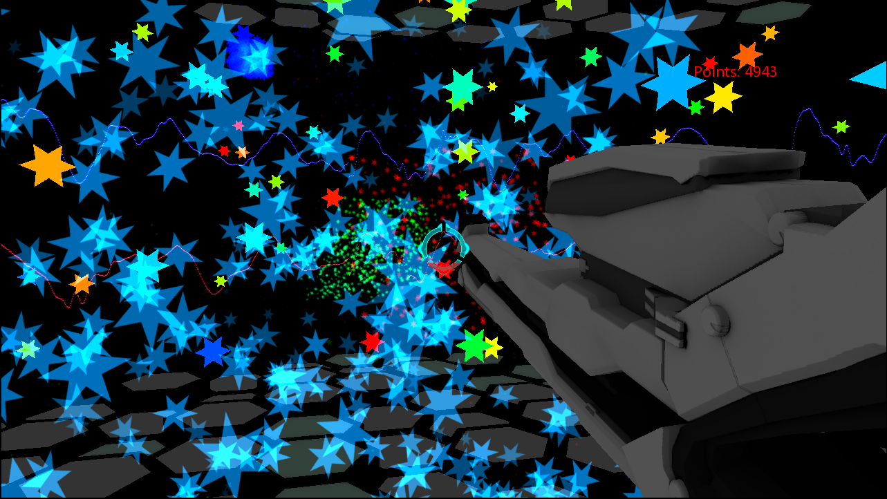 Shooting Stars is a puzzle platform game in which you are able to play your music. You move along a path generated by the highs and depths of the song of your choice while trying to shoot targets which are generated by a similar algorithm; all while watching the respective music video playing in the background.